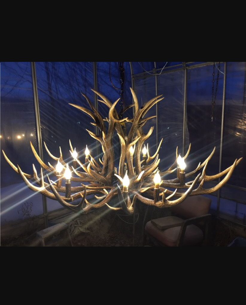 鹿角シャンデリアを自ら組み込む製作者、職人としての一面も持ち合わせている。